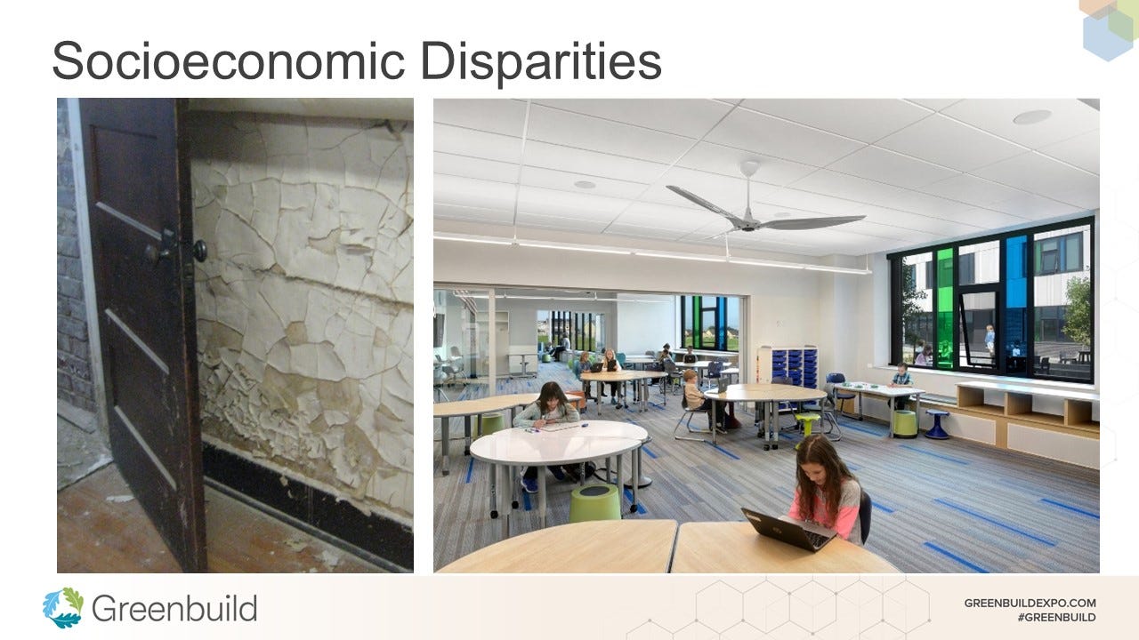 Socioeconomic Disparities: Lower-income communities face poorer quality housing, schools, and other facilities for multiple reasons, including deferred maintenance and limited operations capabilities. As a result they face higher exposure to pollutants and mold and have less resources available to address these challenges, increasing health risks.