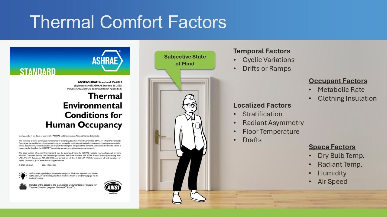 While our industry generally does an inadequate job of accounting for social and behavioral factors, I do think there’s increasing recognition that this is a deficiency. Below is one of the slides from the thermal comfort presentation. It lists the twelve factors (or eleven if you lump the temporal factors together) that ASHRAE Standard 55 defines as contributing to the subjective state of mind that reflects the satisfaction people have with their surrounding thermal environment. And while Stu and I are asking that we go beyond these factors, we recognize that as an industry we don’t do as an effective job as we should accounting for just these factors alone, or teaching how to account for them.