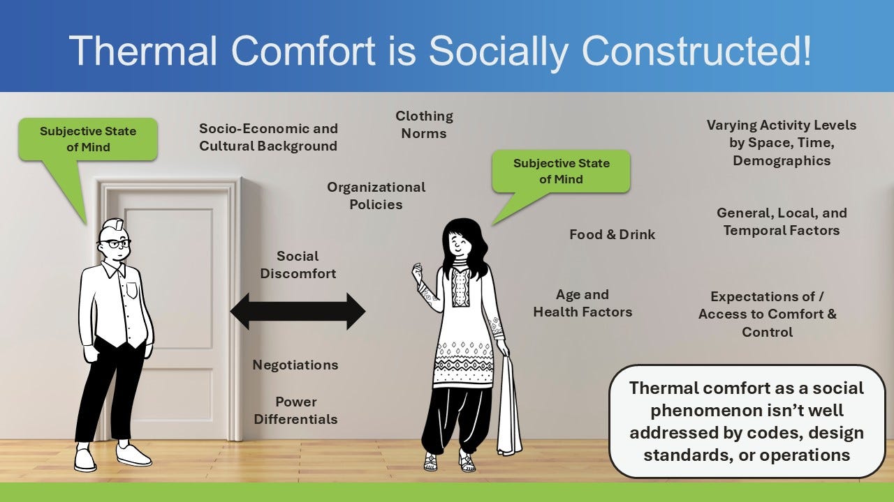 But regardless of how well we collectively account for these twelve factors, we still must do a better job of accounting for the social. And that’s because thermal comfort, or really most any experience within the built environment, is socially constructed. Thermal comfort isn’t just our physiological and psychological responses to the physical environment - it’s shaped by things like socio-economic background, socially defined activity levels, organizational policies, and clothing norms. Anthropology and other social sciences teach us that experiences, including comfort are relational, not just individual. For these disciplines, the smallest unit of study isn’t an individual but the relationship between two people and their environment. And we measure it by talking to people while they’re in their spaces, and observing them, making it a behavioral assessment in addition to a building performance assessment.